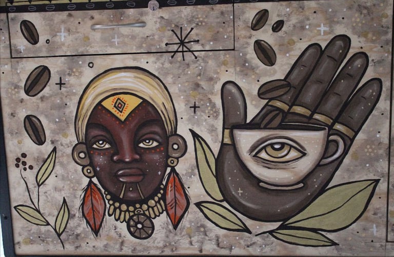 Murals designed and painted to decorate the walls, and the coffee cart for this genuine cafe, full of art and good flavours.